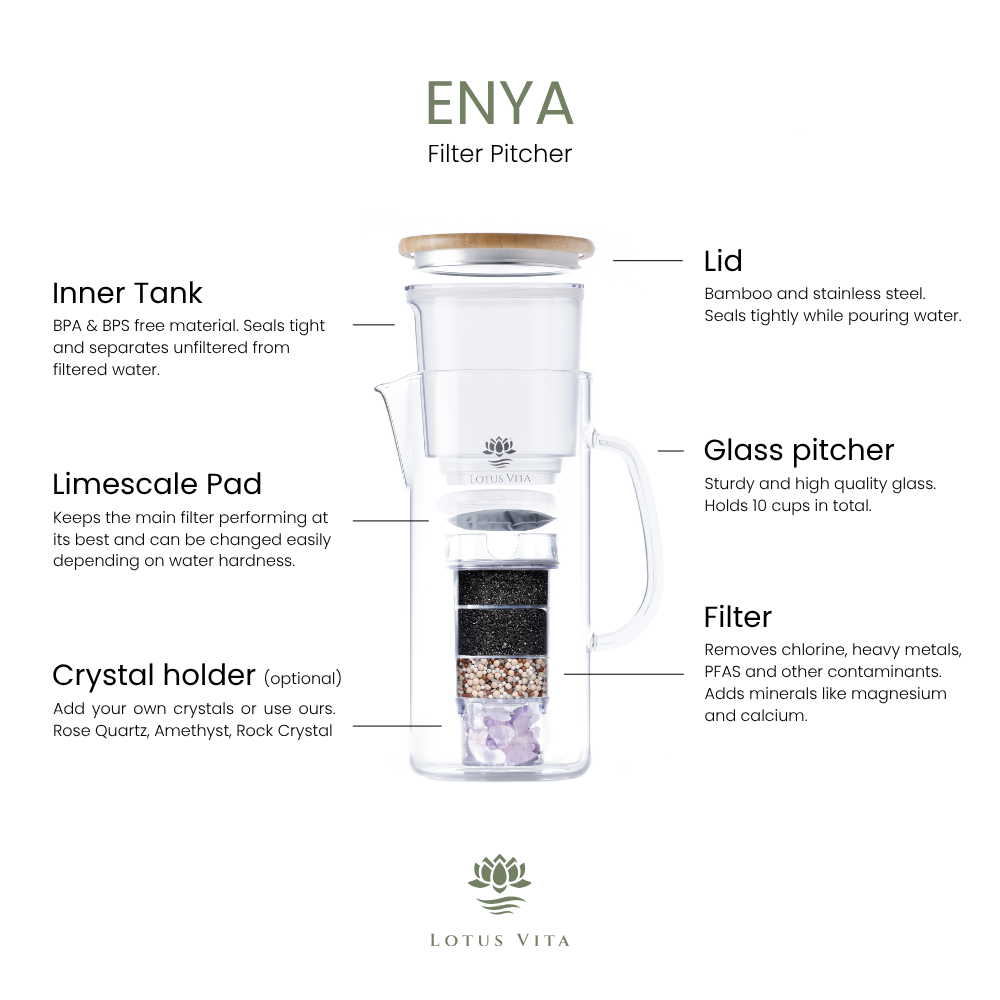 The Enya glass pitcher transforms your tap water, so you can build habits that support your well-being. It’s the simple start to better hydration and clean water.